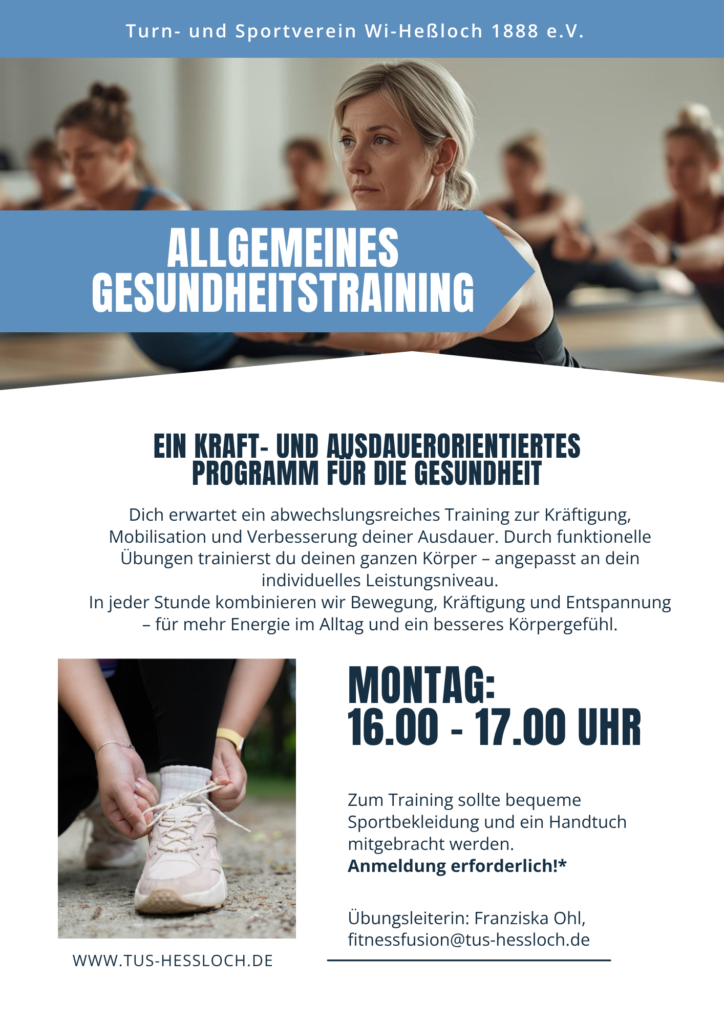 Das Allgemeine Gesundheitstraining wird von Franziska Ohl (fitnessfusion@tus-hessloch.de) geleitet. Sie ist ausgebildete Kursleiterin für Hatha-Yoga und Präventionstrainerin.