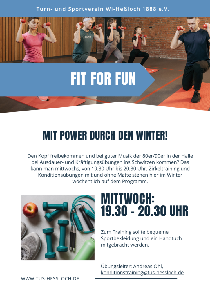Unser erster Vorsitzender, Andreas Ohl, leitet diese Gruppe. Falls Du Fragen hast, schreib ihm unter konditionstraining@tus-hessloch.de